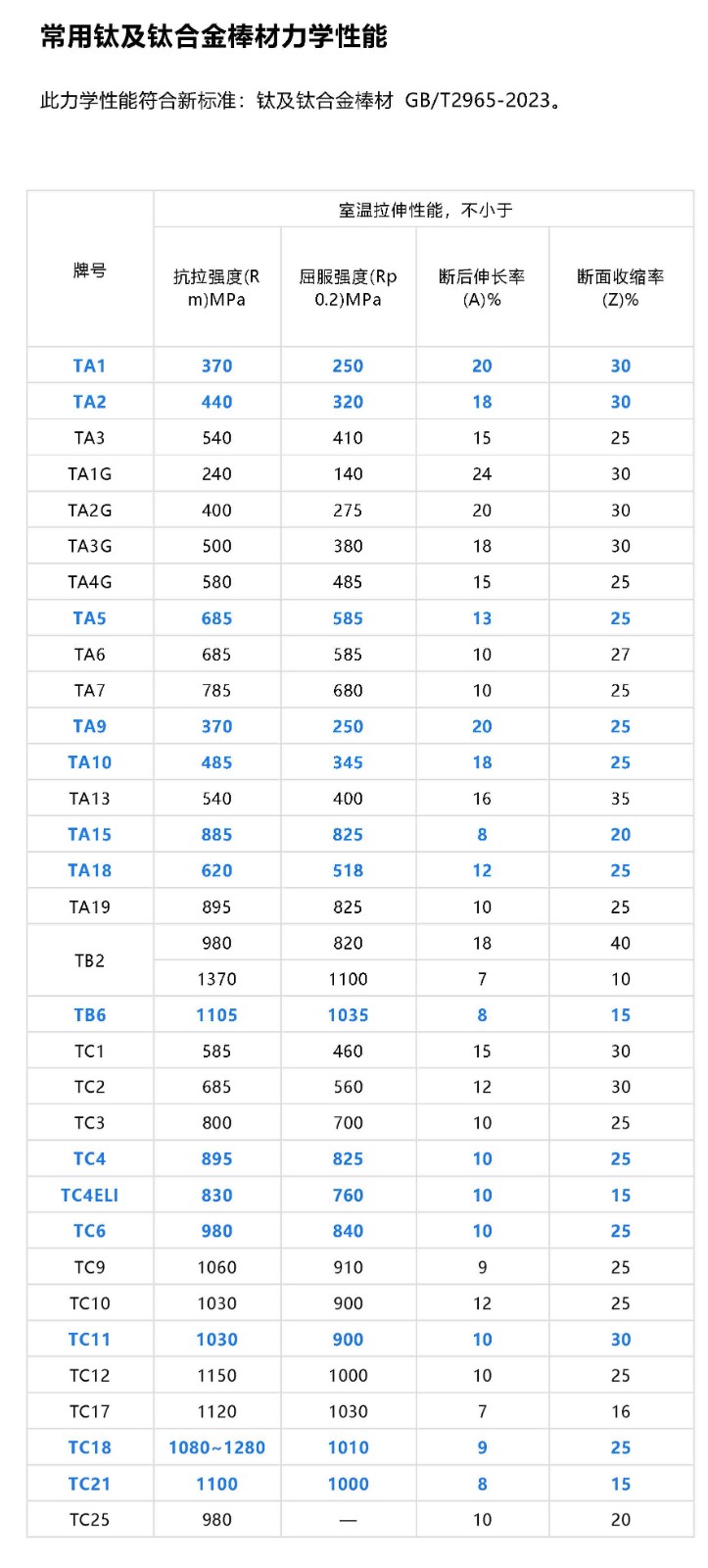 20世紀(jì)50年代以來(lái),鈦及鈦合金因具有優(yōu)異的綜合性能,得到了世界各國(guó)的高度重視,在各行各業(yè)獲得了廣泛的應(yīng)用。鈦合金牌號(hào)眾多,各種合金各有特點(diǎn),按合金類(lèi)型主要分為α及近α型鈦合金、α+β型鈦合金和β型鈦合金。介紹各種典型鈦合金的物理性能和力學(xué)性能。